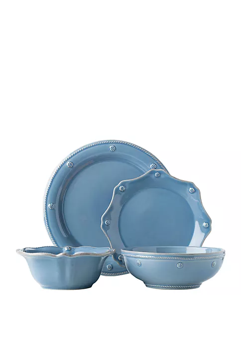 Rimmed with a simple thread and adorned with a sprinkling of berries, this iconic dinnerware set from Juliska embraces historic motifs in a sublime blue hue. This set includes a round dinner plate, scalloped dessert/salad plate, cereal/ice cream bowl, and a 7.75-inch coupe pasta bowl.