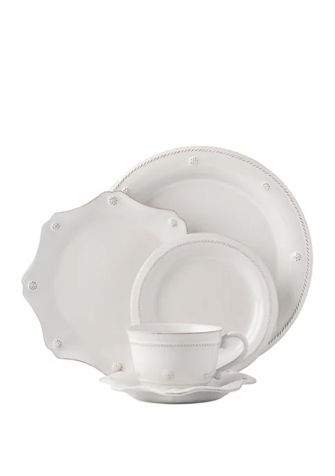 Rimmed with the simple thread and adorned with a sprinkling of berries, the new 5-piece place setting in Whitewash contains a dinner plate, scalloped dessert/salad plate, round side/cocktail plate, scalloped saucer, and new a teacup.