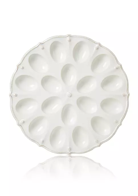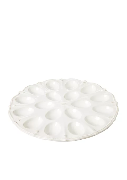 Display your deviled eggs on this platter that boasts a scalloped rim replete. Finished off with the rustic thread and berry motif, this platter is the perfect choice for your next potluck.