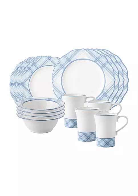 WeβveΒ taken traditional tartan and given it a modern twist in fresh hues of chambray blue with a scalloped rim for a dash of understated frill. ThisΒ 16 pieceΒ setΒ providesΒ service for four and includes 4 dinner plates, dessert/salad plates, cereal/ice cream bowls and mugs.Β Β
