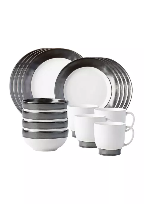 From our Emerson Collection – Rimmed in burnished Pewter Stoneware, our Emerson collection is elegant, rich and warm. This 16 piece set provides service for four and includes 4 dinner plates, dessert/salad plates, cereal/ice cream bowls and mugs.