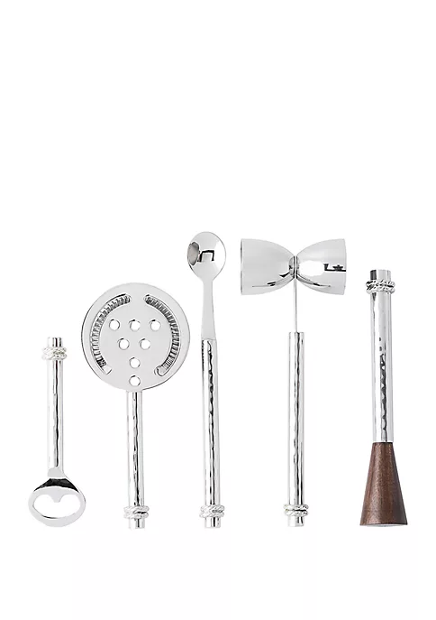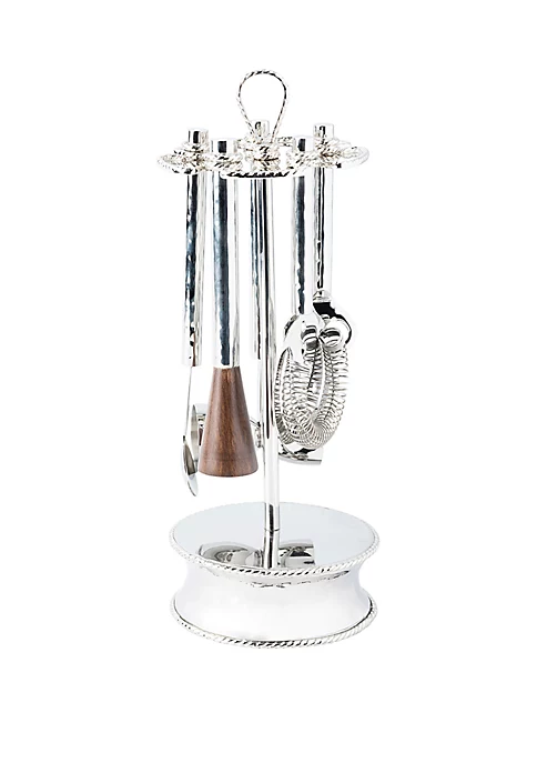 Includes stand and five tools: double-sided jigger, cocktail strainer, bar spoon, bottle opener, and a muddler.