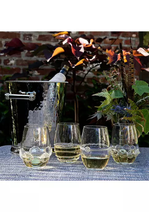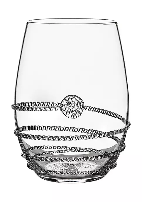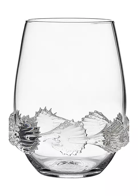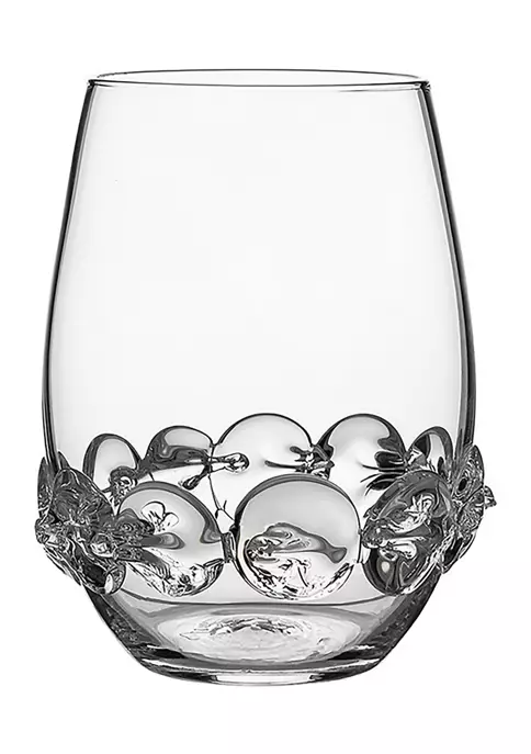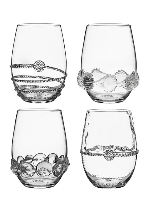 Each mouth-blown stemless wine glass in this set of four features a different signature bohemian motif to create a set that is as handsome as it is unique. Packaged in a signature teal gift box for easy gift giving for a newly engaged couple, a generous hostess or new homeowners.