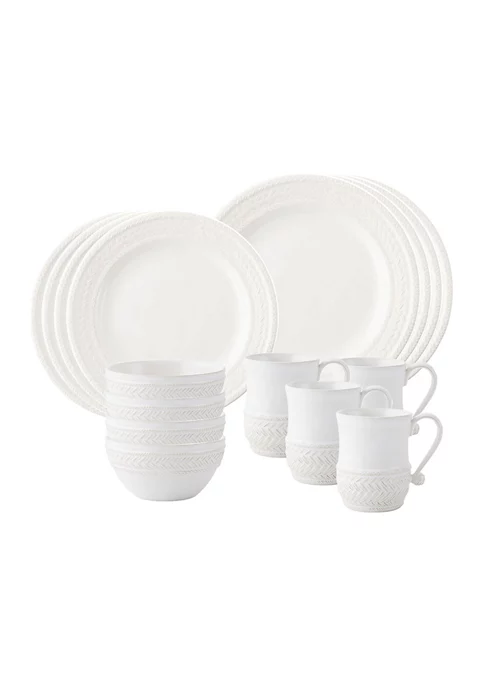This sophisticatedย 16 pieceย place setting in whitewash was inspired by the French basket weave often found in equestrian and nautical traditions. This service for four includes 4 dinner plates, dessert/salad plates, cereal/ice cream bowl and mugs.ย