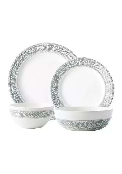 Inspired by the French basket weave often found in equestrian and nautical traditions, this textured woven border is beautifully hand-painted in a neutral grey-wash. This 4 piece place setting contains a dinner plate, dessert/salad plate, cereal/ice cream bowl and coupe pasta/soup bowl.