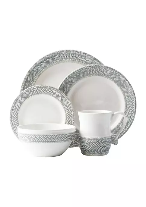 Inspired by the French basket weave often found in equestrian and nautical traditions, this textured woven border is beautifully hand-painted in a neutral grey-wash. This 5 piece place setting contains a dinner plate, dessert/salad plate, side/cocktail plate, cereal/ice cream bowl and mug.