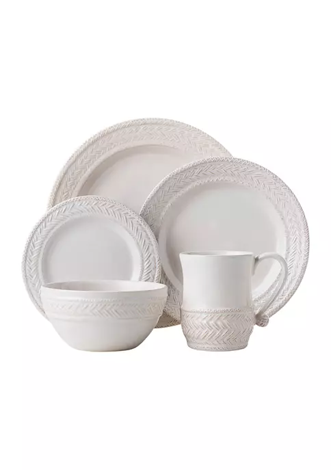 This sophisticated 5-piece place setting in whitewash was inspired by the French basket weave often found in equestrian and nautical traditions. Contains a dinner plate, dessert/salad plate, side/cocktail plate, cereal/ice cream bowl and mug.