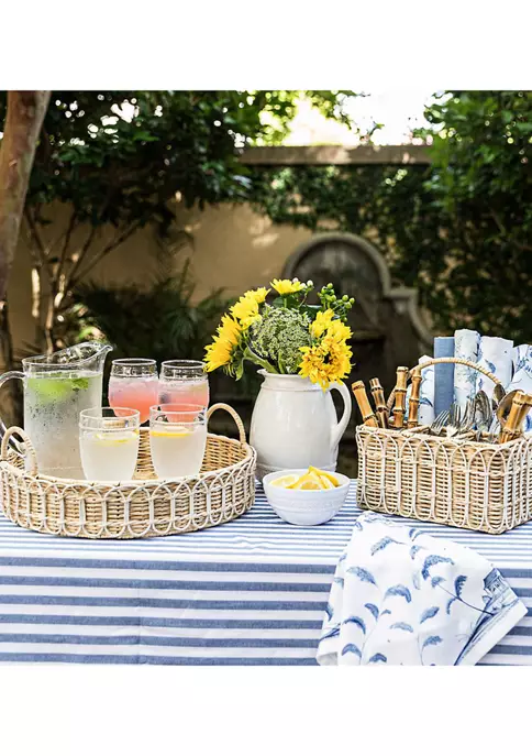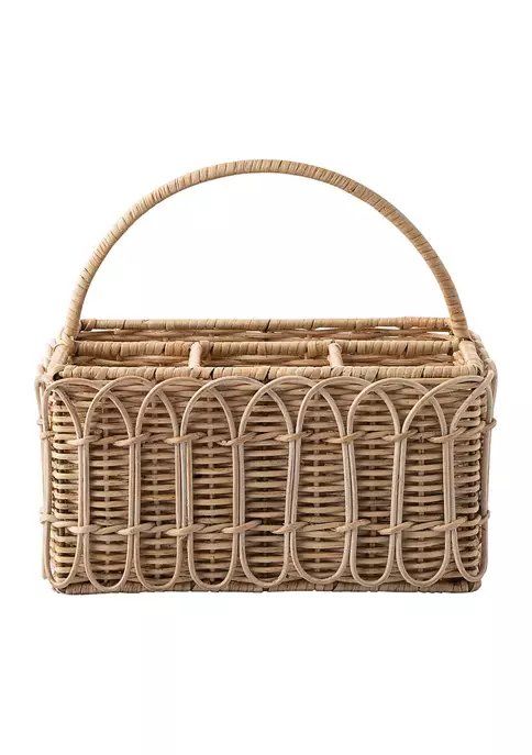Alfresco feasts and boisterous buffets are kept tidy with this chic caddy that organizes utensils, napkins, and condiments while delivering an element of natural beauty in handwoven rattan.