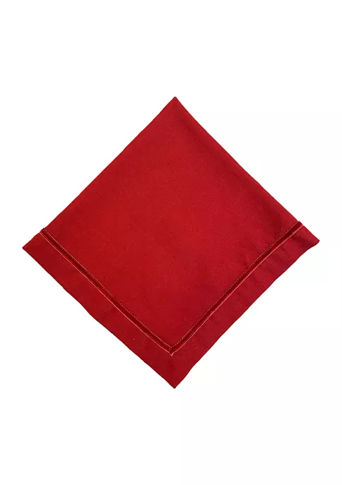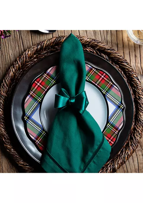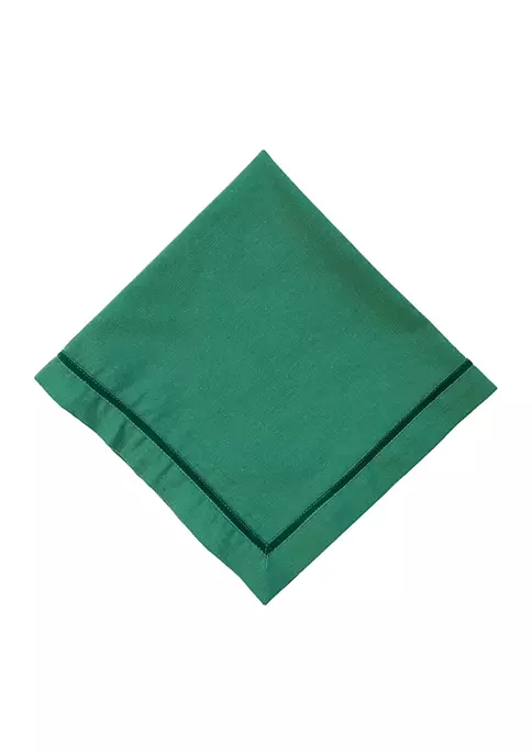 This woven napkin in elegant Evergreen napkin is trimmed with a luxurious strip of velvet ribbon to add a festive flair to your tables all Fall or Holiday season long.