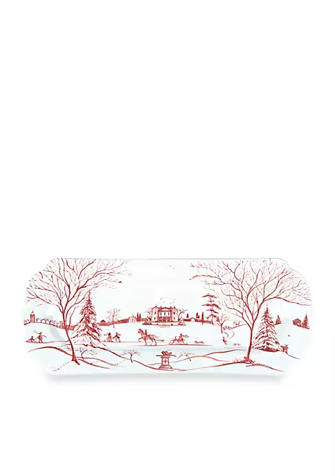 From the Country Estate Collection – From sleigh rides to skating, the scene depicted on the Winter Frolic hostess tray is bustling with wintry activities. Topped with welcoming tendrils of chimney smoke and illustrated in the festive Ruby hue, this Main House serving dish is the consummate gift for the season – or covet for yourself to display appetizers, homemade cookies, and holiday cards. Comes presented in an illustrated box trimmed with a tartan bow and jingle bell for chic and easy gift-giving. The ceramic stoneware is made in Portugal and is oven, microwave, dishwasher and freezer safe.